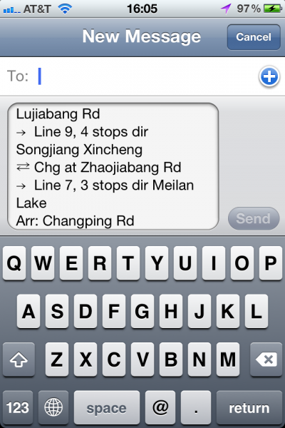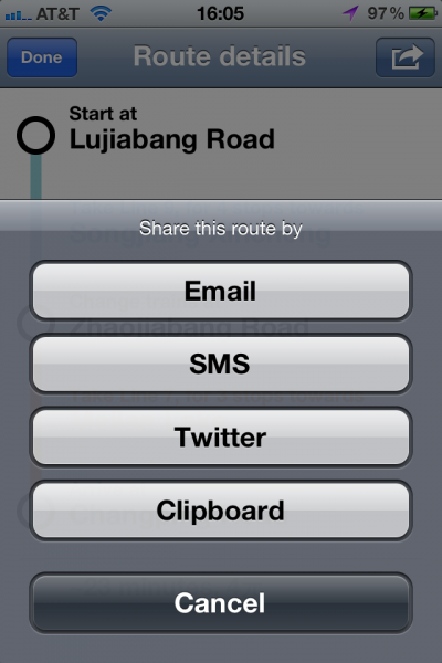Every step of the way, you have clear instructions of which line to take, and which direction. What's more, you can easily share the route instructions, by email, SMS/iMessage, Twitter or copying to clipboard: