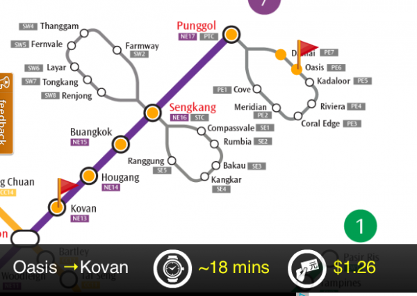 We've just pushed an update to our Explore Singapore map, which adds route-planning for the LRT (Light Rail Transit) system in Singapore. There are currently three LRT lines: Bukit Panjang LRT, Sengkang LRT and Punggol LRT. You can plan a route between two LRT stations, or from an MRT to an LRT station. The map will show the fastest route, and the total journey cost.