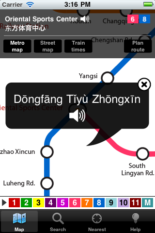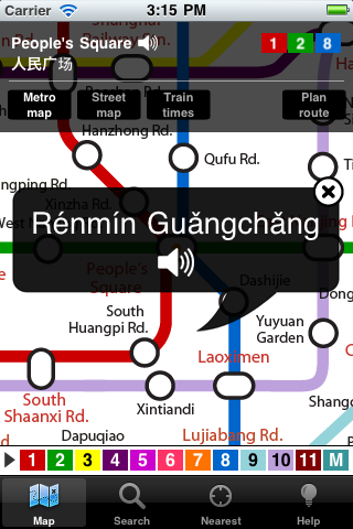 When you tap to hear the audio pronunciation for a station, you'll also see the Pinyin for the station name, complete with tone marks. This is really handy for stations with alternative English names, for example: