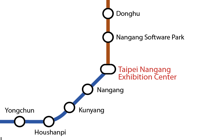 The Taipei Metro station at Taipei Nangang Exhibition Center now serves both the Neihu Line (brown) and Nangang Line (blue). As of February 27, 2011, riders will no longer need to take a shuttle bus to transfer lines, cutting transfer times between the two lines dramatically.