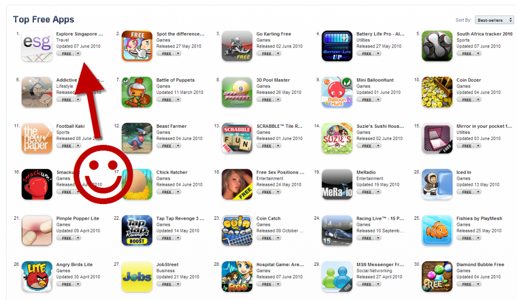Wow! When we made Explore Singapore for iPhone free for 1 week, we expected a lot of downloads: what we didn't expect was we'd become the #1 app in all categories on the Singapore iTunes Store! Check out this screengrab we took: