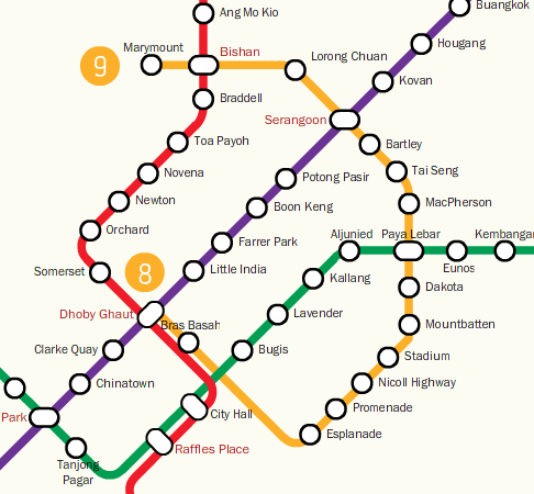 The Singapore MRT Circle Line was extended today. Previously the line ran from Marymount to Bartley, the new extension loops through central Singapore all the way to a 3-way interchange at Dhoby Ghaut. There's also a new interchange with the East West Line at Paya Lebar. Trains will run every 5 minutes, or up to every 3.5 minutes at peak times.