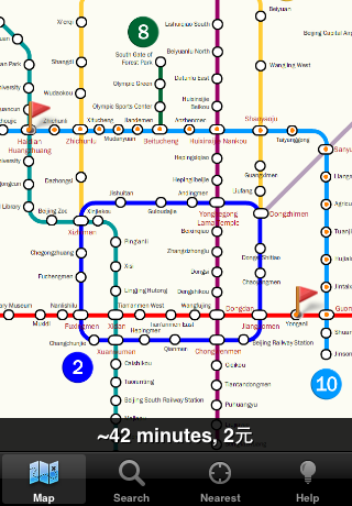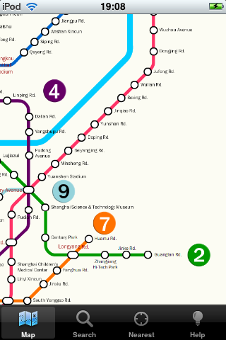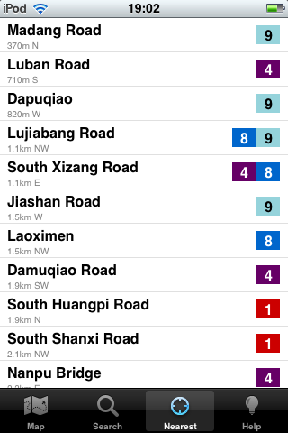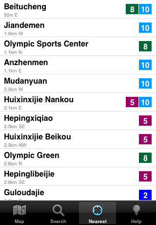 One of the great new features in version 1.5 is "Find my nearest". When you're exploring the capital, and want to find the nearest subway station, just tap the "Nearest" tab. Using your iPhone's GPS (or wifi signals on the iPod touch) we'll provide a list of nearest stations, as well as approximate distances and directions: Another handy addition is line numbers, so you can quickly see which color line is which