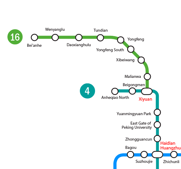 The northern section of Line 16 has opened in Beijing, bringing the total number of lines in Beijing to 18, with a total route length of 574km. Line 16 connects Xiyuan on Line 4 with Bei'anhe, in Haidian District. In the future Line 16 will stretch as far as 48 km, from Bei'anhe south to Xiaoyueyuan near Marco Polo Bridge, in Fengtai District.