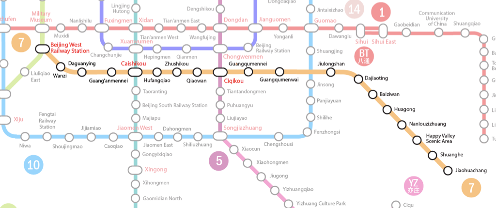 This week we’re previewing several new lines and extensions which opened at the end of December 2014. Today, Beijing Subway Line 7. Line 7 is a brand new east-west line, starting at Beijing West Railway Station and heading east through Fengtai, Xicheng, Dongcheng and Chaoyang districts.